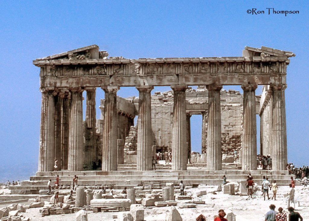To begin with, most of the Memorial, including all of the structure seen here, is concrete. The statue of Lincoln and the surfaces in the chamber surrounding it are in fact marble. Marble is calcium carbonate rock, just like caves with speleothems—stalactites and stalagmites. But the caves and the speleothems are native limestone. Marble is limestone that has been modified (metamorphosed) by the temperatures and pressures caused by thick overburden sediments. Both are water soluble, but the solubility is measurable, and yes, it normally takes a long time. Fig. 2, below, is a photo that I took of a marble and limestone structure that has been standing out in the open for around 2400 years. It has been damaged by human wear and tear, by earthquakes, and even by a 17th Century Venetian bomb, but for the most part, rainwater has had minimal effect on the stone itself.