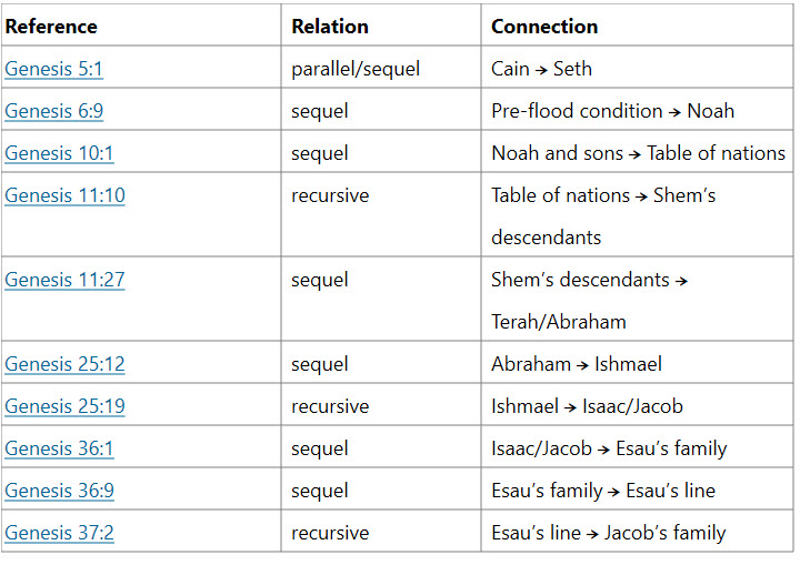 Walton presents the following table to show how other toledoth (plural) relate to material preceding and following them: