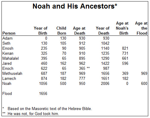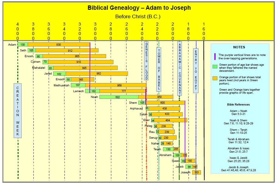 I prepared the above chart many years ago, from one of the many English translations based on the 11th century AD Masoretic Text of Genesis. The Masoretic Text is a compendium of the earliest extant Hebrew manuscripts of the Old Testament and Apocrypha that were available prior to discovery of the Dead Sea Scrolls. English language Bibles from both Christian and Jewish translators are usually based on the Masoretic Text.
