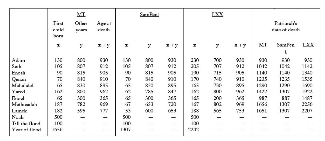 I prepared the above chart many years ago, from one of the many English translations based on the 11th century AD Masoretic Text of Genesis. The Masoretic Text is a compendium of the earliest extant Hebrew manuscripts of the Old Testament and Apocrypha that were available prior to discovery of the Dead Sea Scrolls. English language Bibles from both Christian and Jewish translators are usually based on the Masoretic Text.
